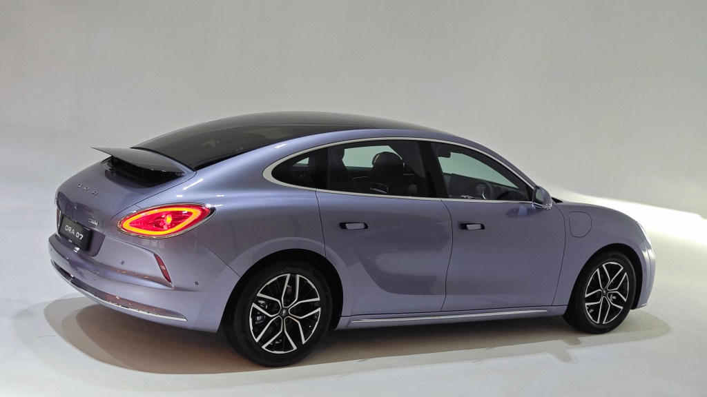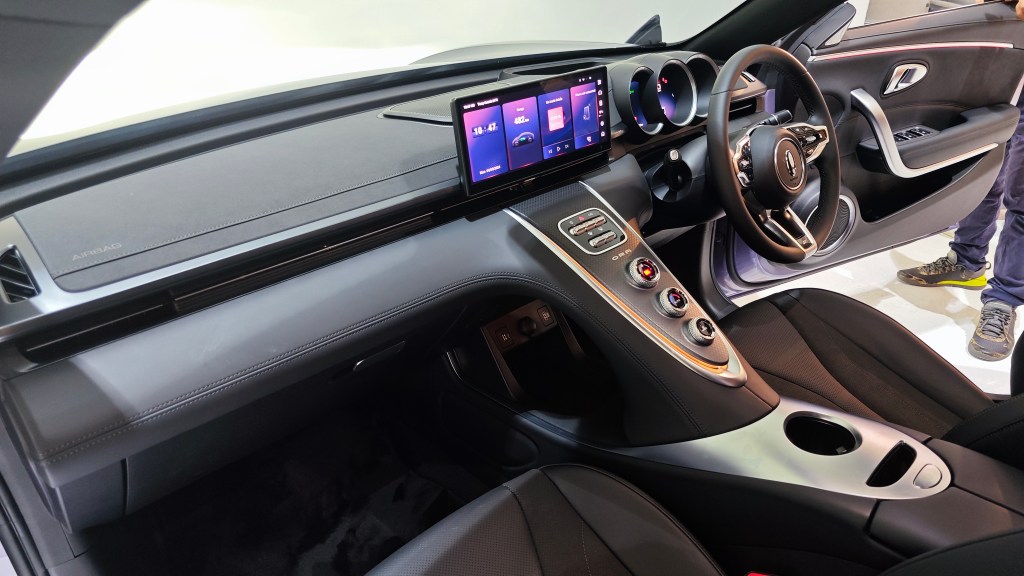The ORA 07’s silhouette, reminiscent of a fastback automobile, features hidden door handles, frameless doors and an adaptive electric spoiler, asserting its sports car inspiration. Measuring 4871 mm in length, 1862 mm in width, and 1500 mm in height, the vehicle presents an imposing stance.