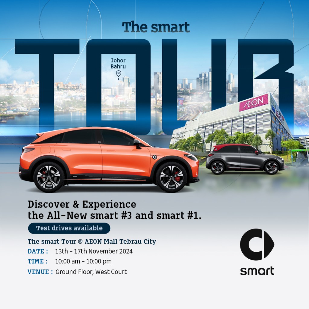 smart Malaysia is thrilled to announce the launch of the smart Tour Roadshow at Aeon Tebrau, taking place from 13 to 17 November 2024. This much-anticipated event invites all Johoreans to discover the innovative smart #1 and smart #3 electric vehicles firsthand, marking a significant celebration of electric mobility and smart’s anniversary.
