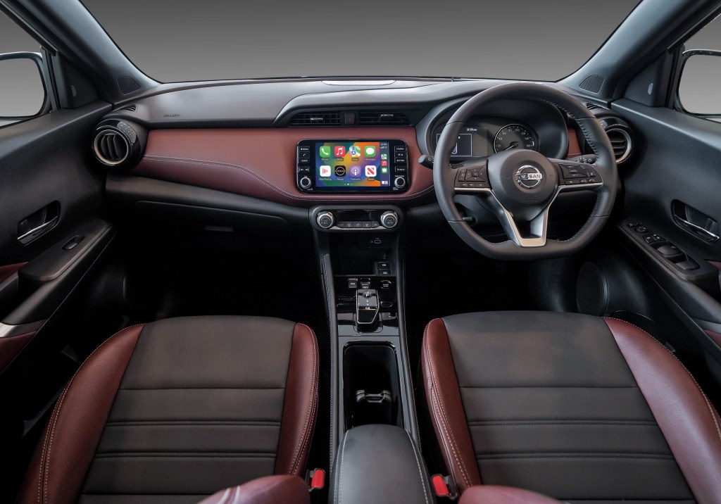 The Nissan KICKS e-POWER features a 7-inch full-colour driver’s instrument display, a sporty D-shaped flat-bottom steering wheel with multi-function controls, and an infotainment system with an 8-inch touchscreen, offering Android Auto and Apple CarPlay connectivity.