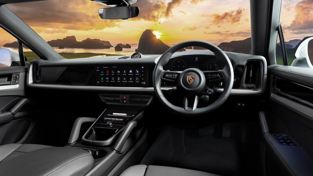 A new 12.6-inch curved instrument cluster and 12.3-inch infotainment screen are standard part of the new Porsche Driver Experience. The automatic gear selector in the new Cayenne is now positioned to the left of the steering wheel on the dashboard. This makes room on the new centre console for storage compartments and a large air conditioning controller in an elegant black panel design. Large, easily accessible controls combined with mechanical air conditioning switches and volume controller ensure optimum usability and a refined look.
