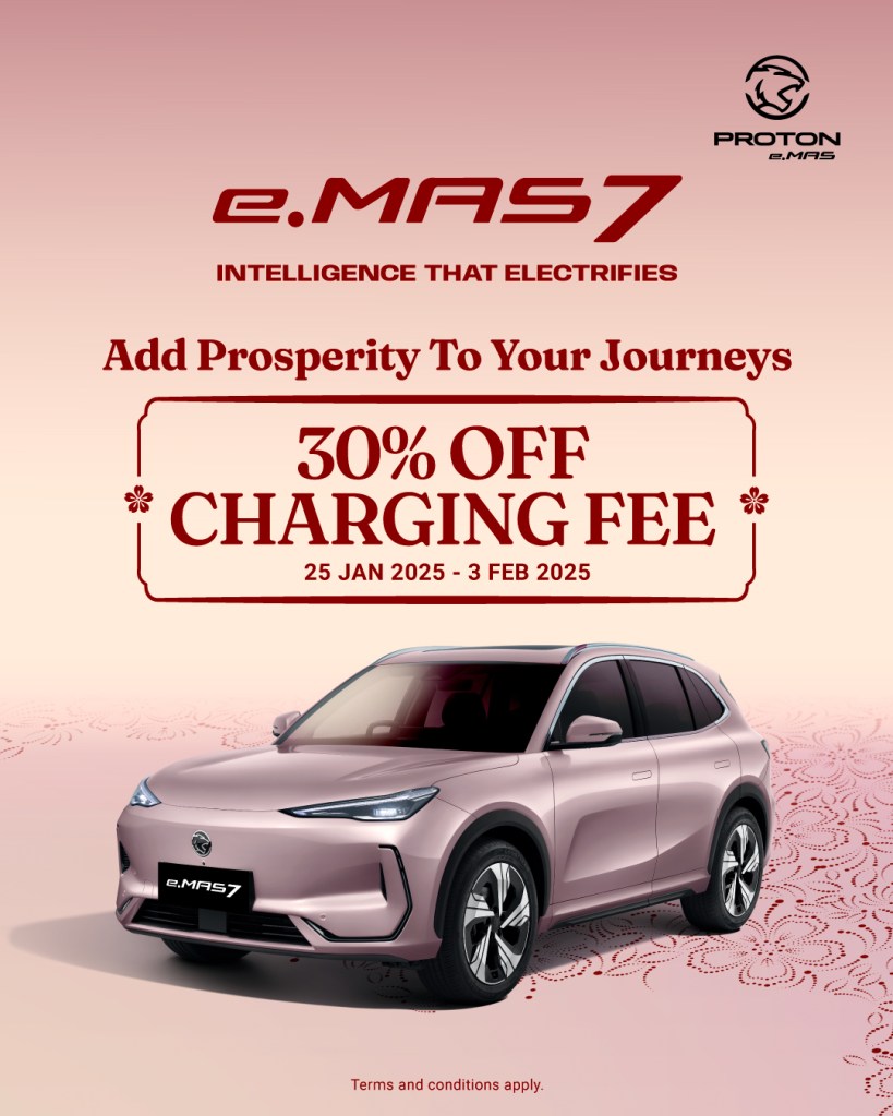 To ring in the Lunar New Year and celebrate the delivery of the first Proton e.MAS 7 to our customers, PRO-NET is offering a 30% discount on public charging fees. From 25th January to 3rd February 2025, Proton e.MAS and smart EV owners can enjoy this special offer at over 80% of public charging stations. Just use the Proton e.MAS or Hello smart apps to start your charging session, and the discount will be applied automatically.