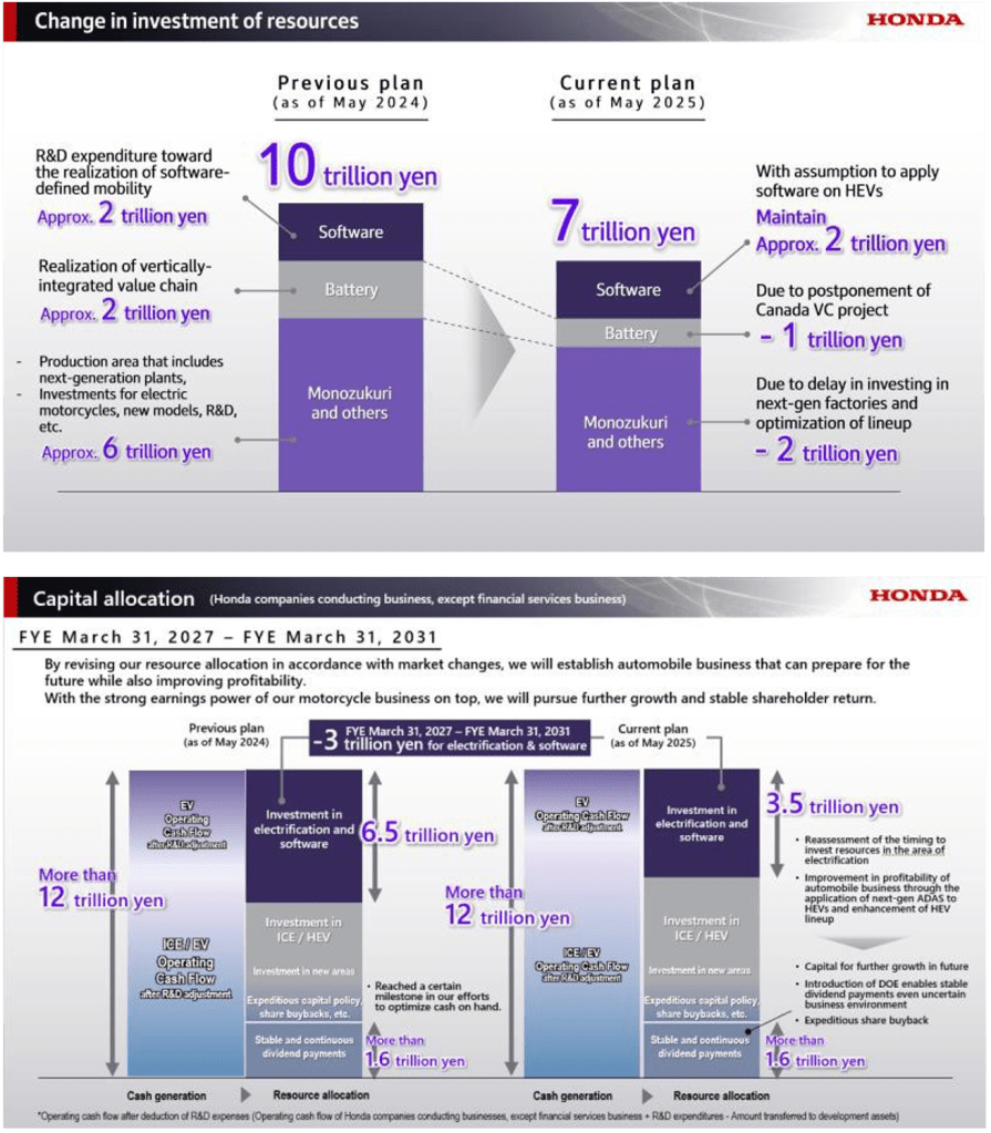 Regarding the changes in capital allocation over the five-year period starting from the 2027 fiscal year, in light of the reduction in the resource investment amount, Honda will strive to generate more than 12 trillion yen in cash, combining its ability to generate cash stably from its motorcycle business and an increase in unit sales of HEV models. As for resource allocation through the 2031 fiscal year, while reducing EV-related investment by 3 trillion yen, Honda expects a minimal increase in investment related to HEV business. As for shareholder returns, Honda will maintain the previously announced target and strive for more than 1.6 trillion yen.